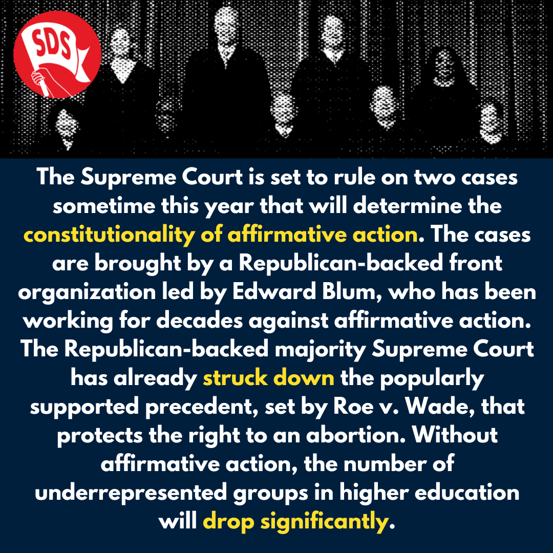 The Supreme Court is set to rule on two cases sometime this year that will determine the constitutionality of affirmative action. The cases are brought by a Republican-backed front organization led by Edward Blum, who has been working for decades against affirmative action. The Republican-backed majority Supreme Court has already struck down the popularly supported precedent, set by Roe v. Wade, that protects the right to an abortion. Without affirmative action, the number of underrepresented groups in higher education will drop significantly.