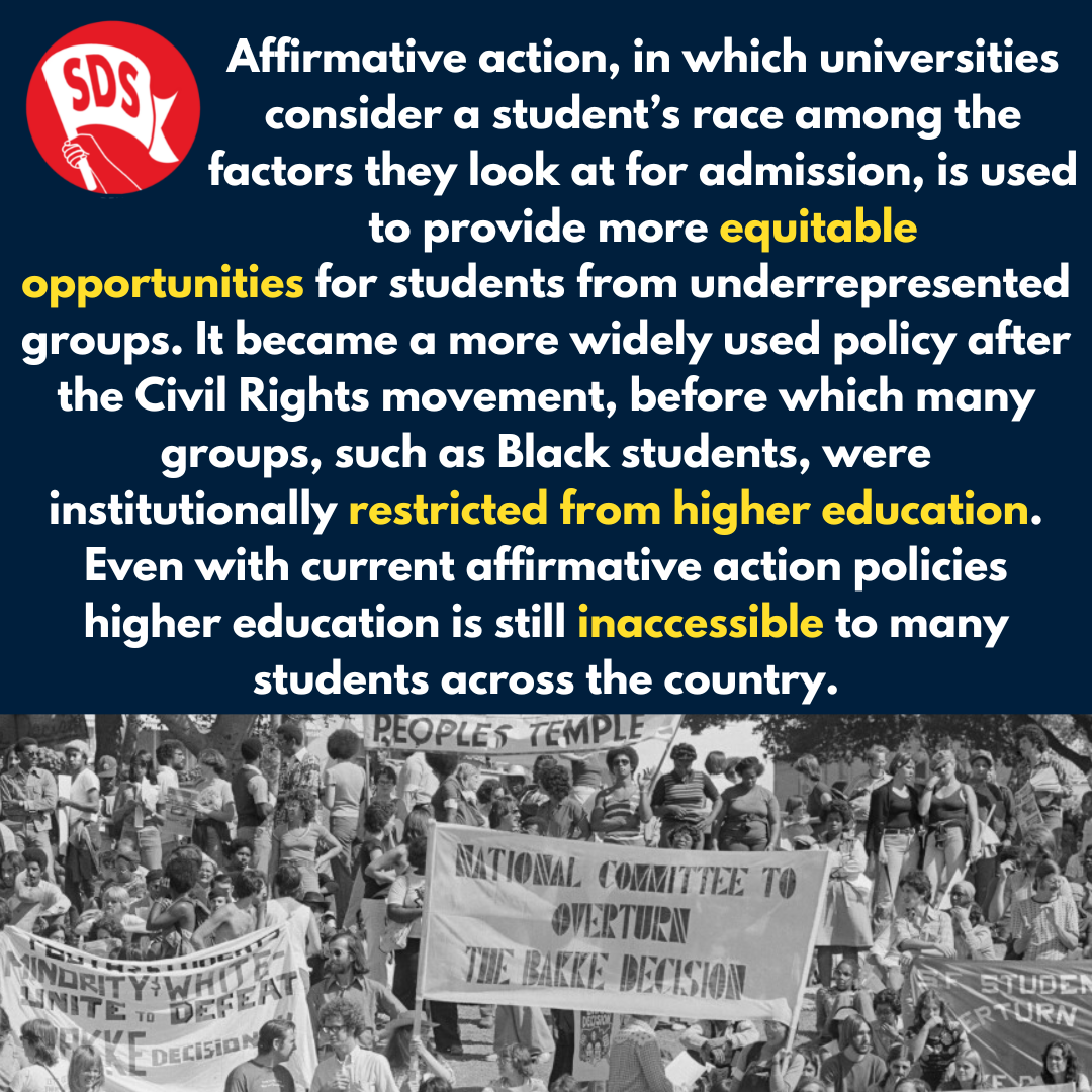 Affirmative action, in which universities consider a student’s race among the factors they look at for admission, is used to provide more equitable opportunities for students from underrepresented groups. It became a more widely used policy after the Civil Rights movement, before which many groups, such as Black students, were institutionally restricted from higher education. Even with current affirmative action policies higher education is still inaccessible to many students across the country.